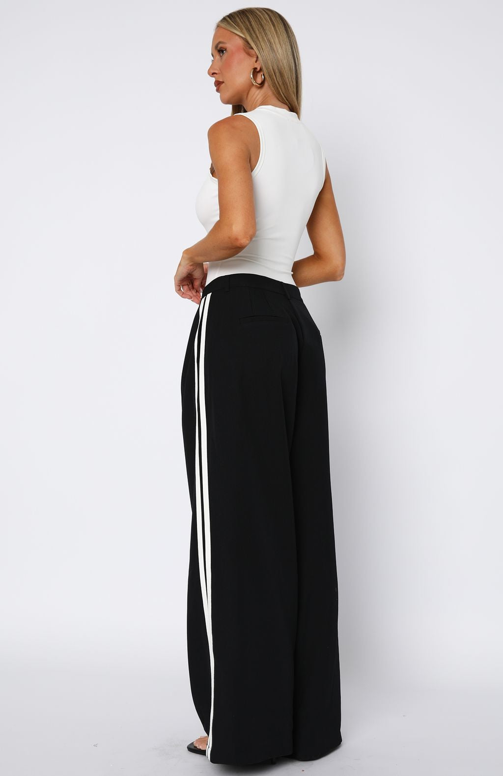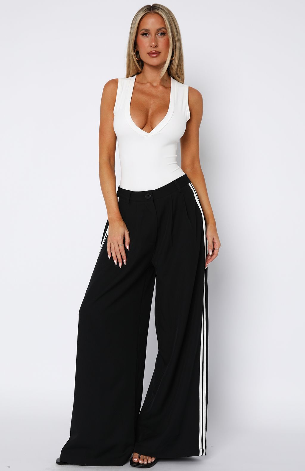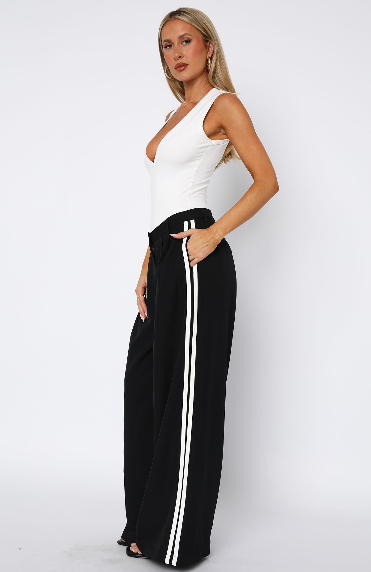 Bring a fresh look to your winter wardrobe with the Don't Believe It Pants in Navy features thick waistband with button and zipper closure centre front, belt loops, side pockets and faux back pockets and wide leg design with double stripe detailing down side. For a laid back vibe pair with a basic tank, sunnies and flats.