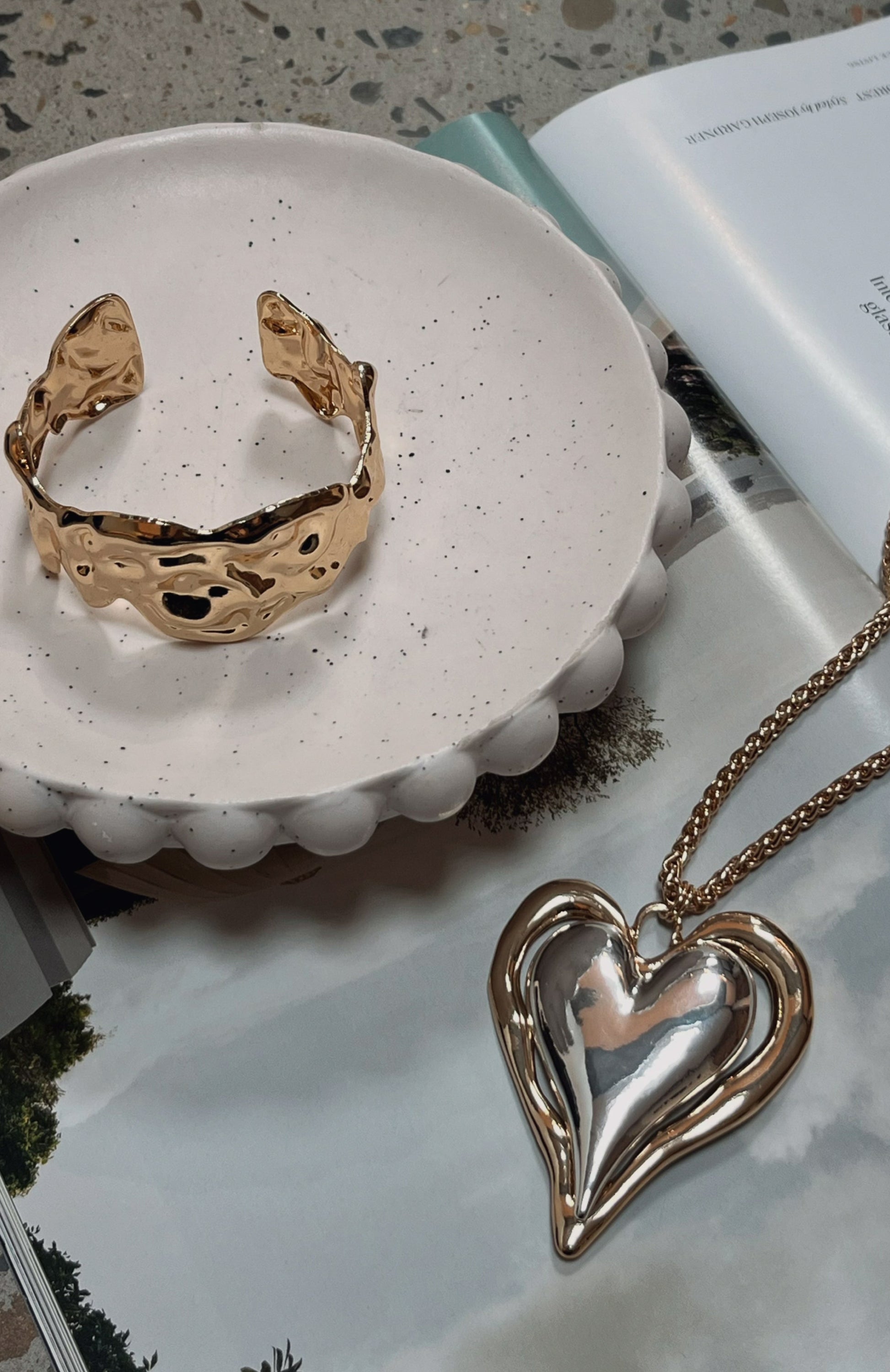 Your festival look is not complete without the Indigo Bracelet in Gold! This bold cuff features an abstract, melted-gold motif that wraps your wrist. We are in love!