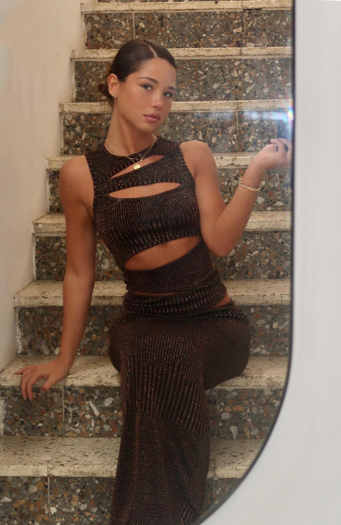 Stand out from the crowd in the Less Than Zero Top in Bronze. Featuring a high neckline, cut-out front design and metallic, stretch fabric. We love this paired with the Never Again Maxi Skirt and clear heels and make them stop and stare.