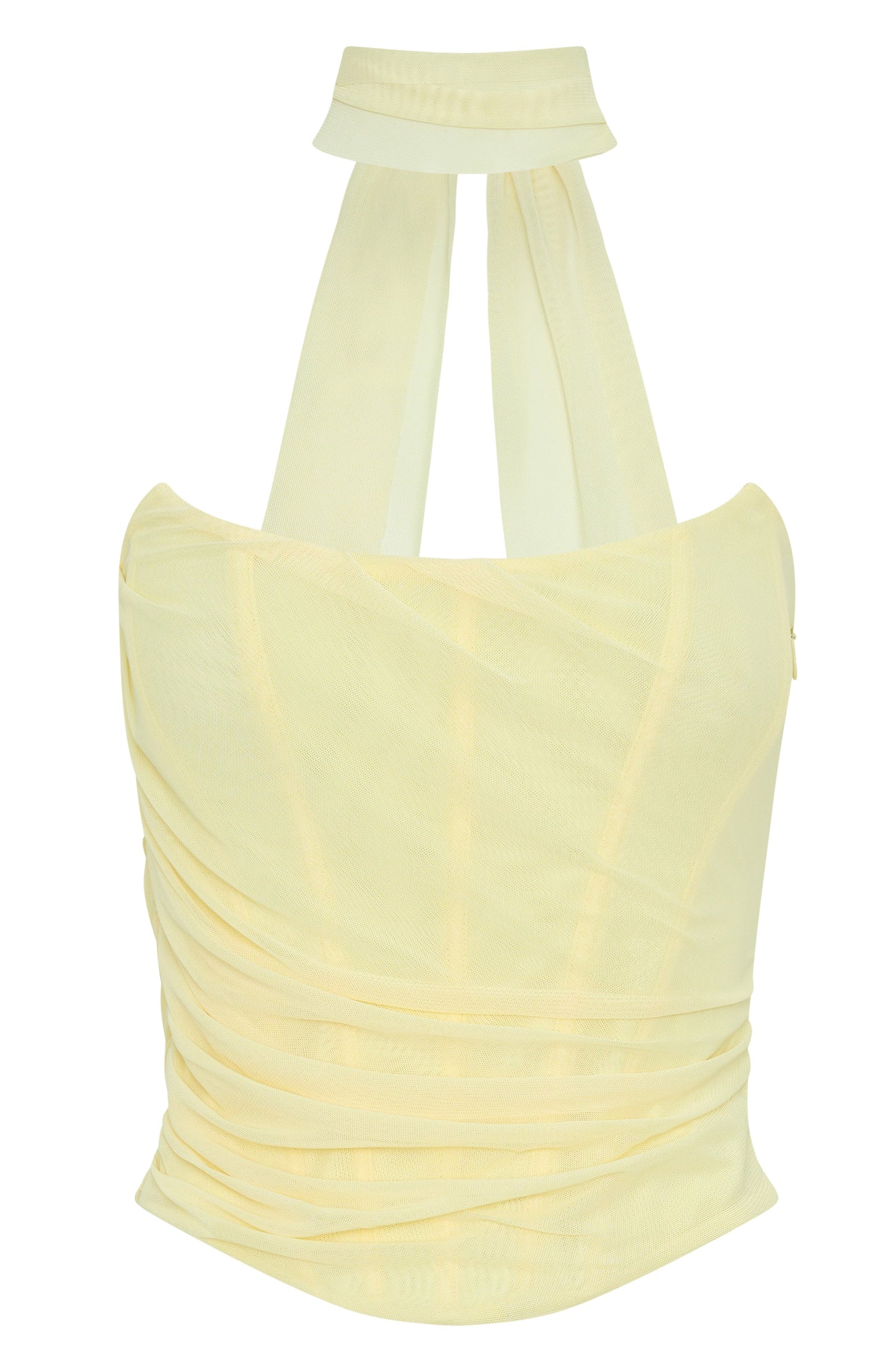The Lovers Lane Strapless Bustier Lemon is our ultimate dream come true! Features a neck tie design, strapless neckline, boning in bodice, invisible side zipper and clasp closure, cropped length and lined. Style with the Loving You Maxi Skirt Lemon for a swoon worthy look!