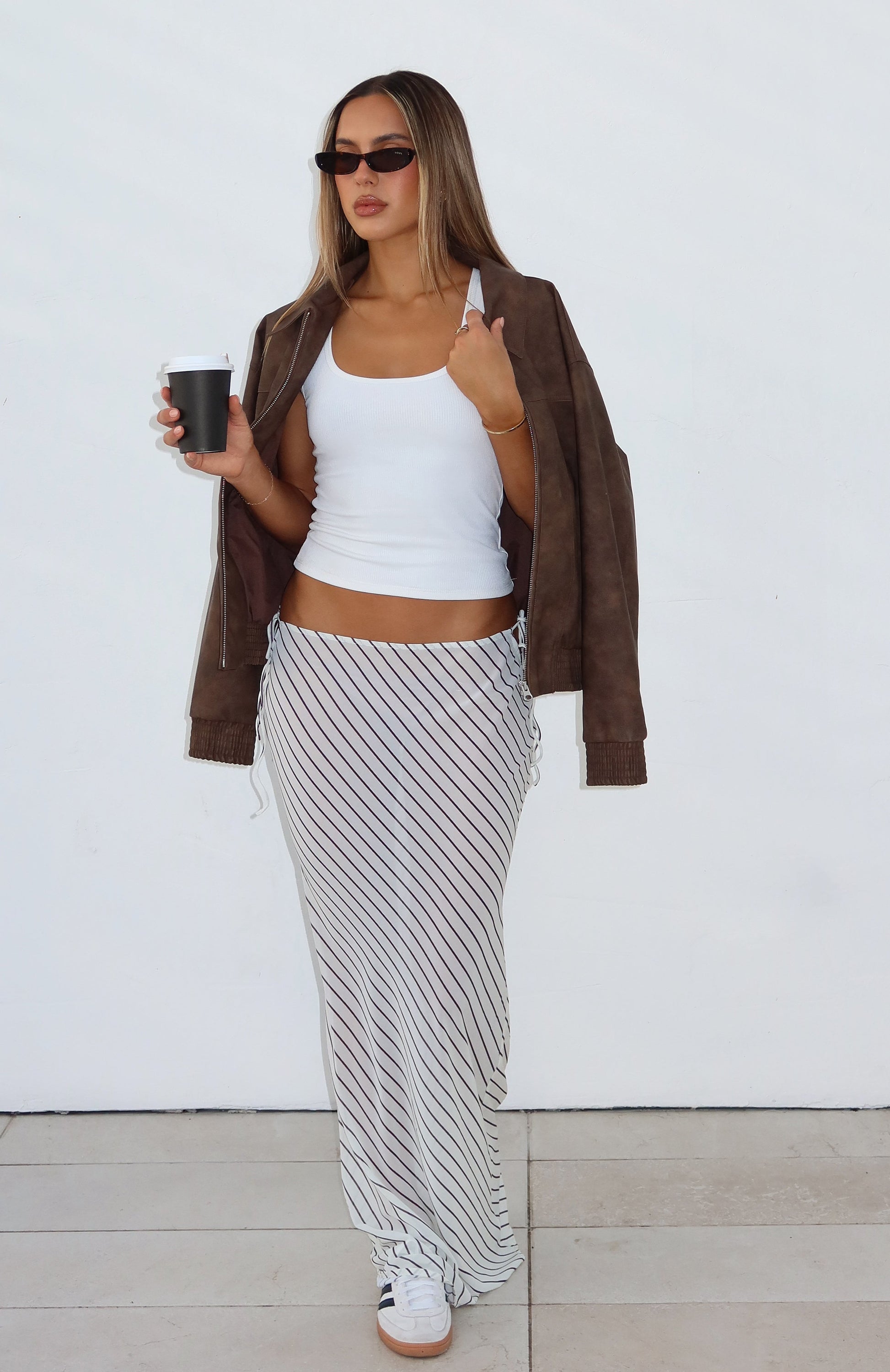 Whether it's cocktail hour under the summer sun or an insta photoshoot, the Luminous Maxi Skirt Cream/Choc Stripe will soon be your go-to. Features a maxi length, cut-out waist design, side self-tie straps, unlined fabric and an easy slip on style. Pair with cool shades and gold accessories for a complete look.