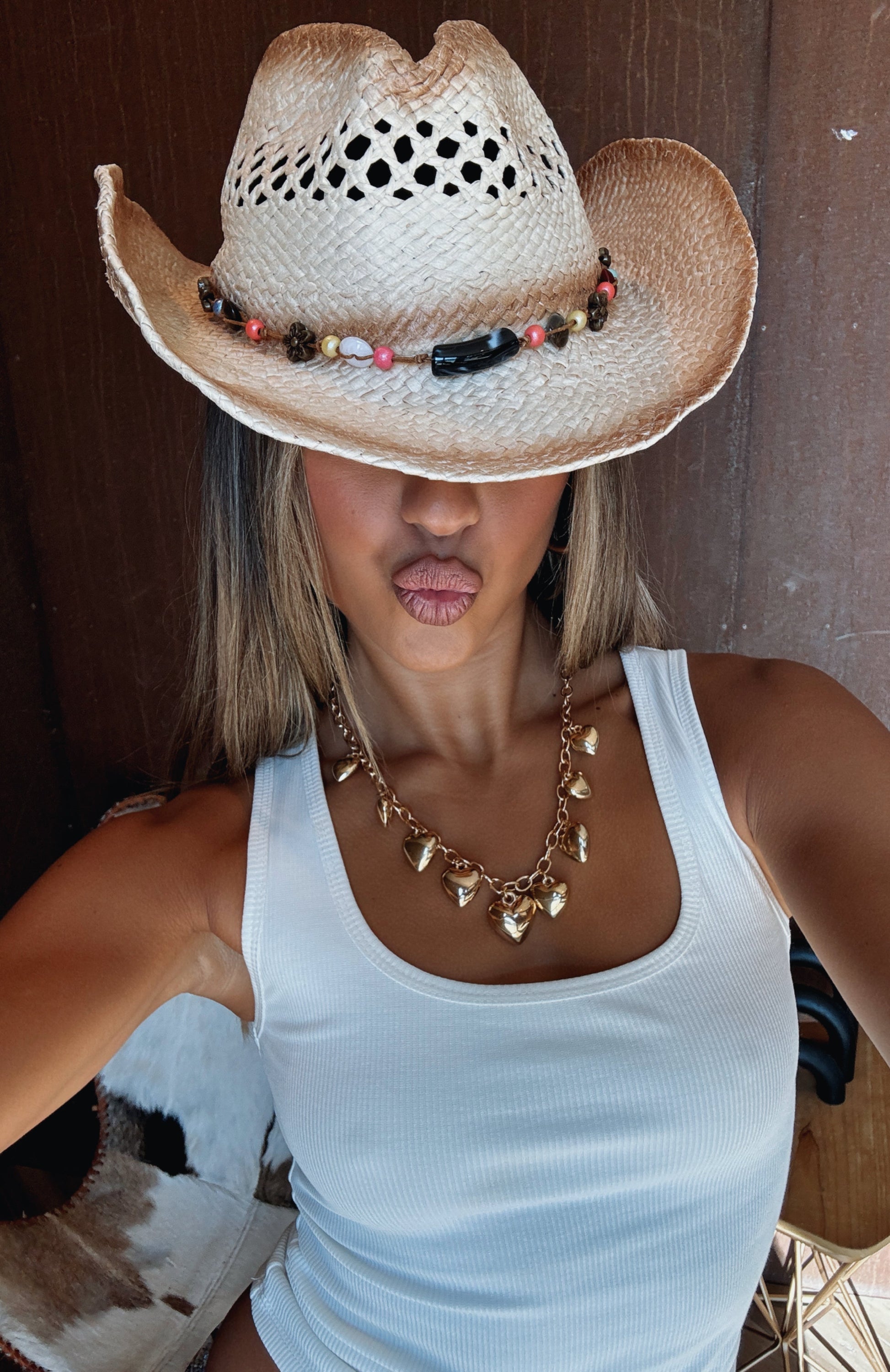 Saddle up for a wild night in the Montana Cowboy Hat Toasted Oats! Features a wide brim design and beaded detailing. The perfect finishing touch for your next festival fit' or dress-up party!