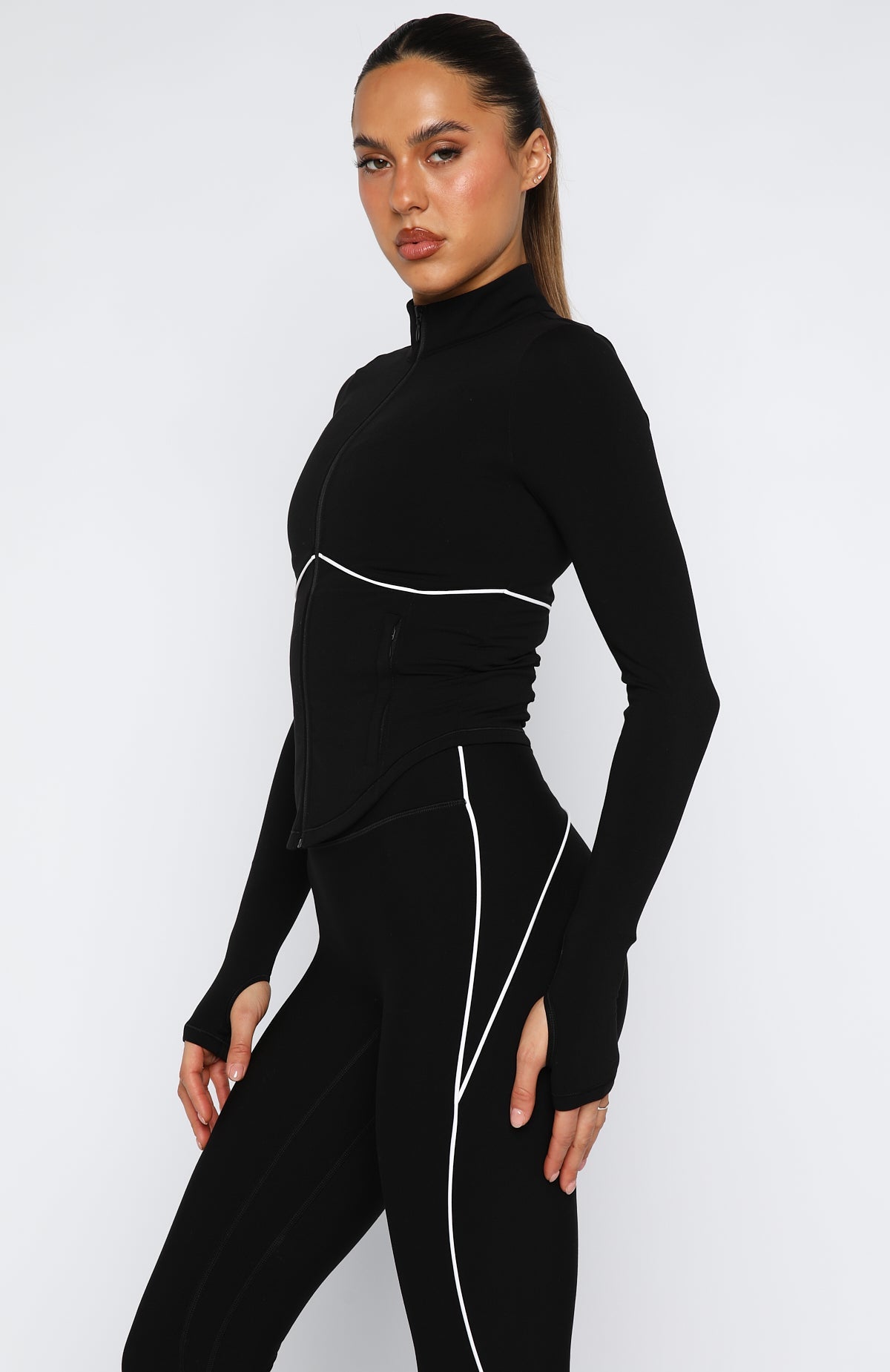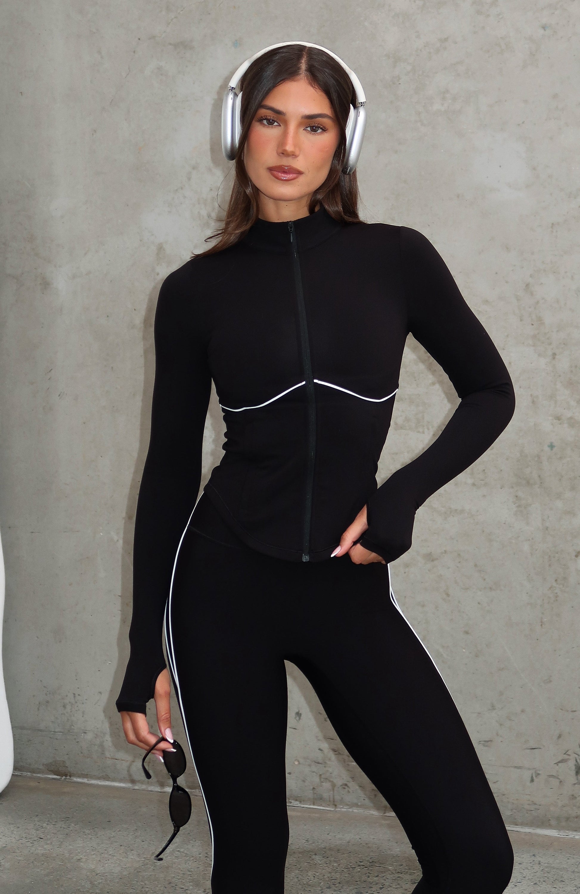 OBSESSED! The Persistence Jacket in Black/White features a sleek front zipper closure, long sleeves, and a fitted silhouette that flatters your shape. Under-bust piping adds structured detailing, while zippered pockets offer secure storage. The jacket is finished with bold WFA initials at the center back and crafted from high-stretch fabric for maximum mobility. Style with the matching Ace High Waisted Leggings.