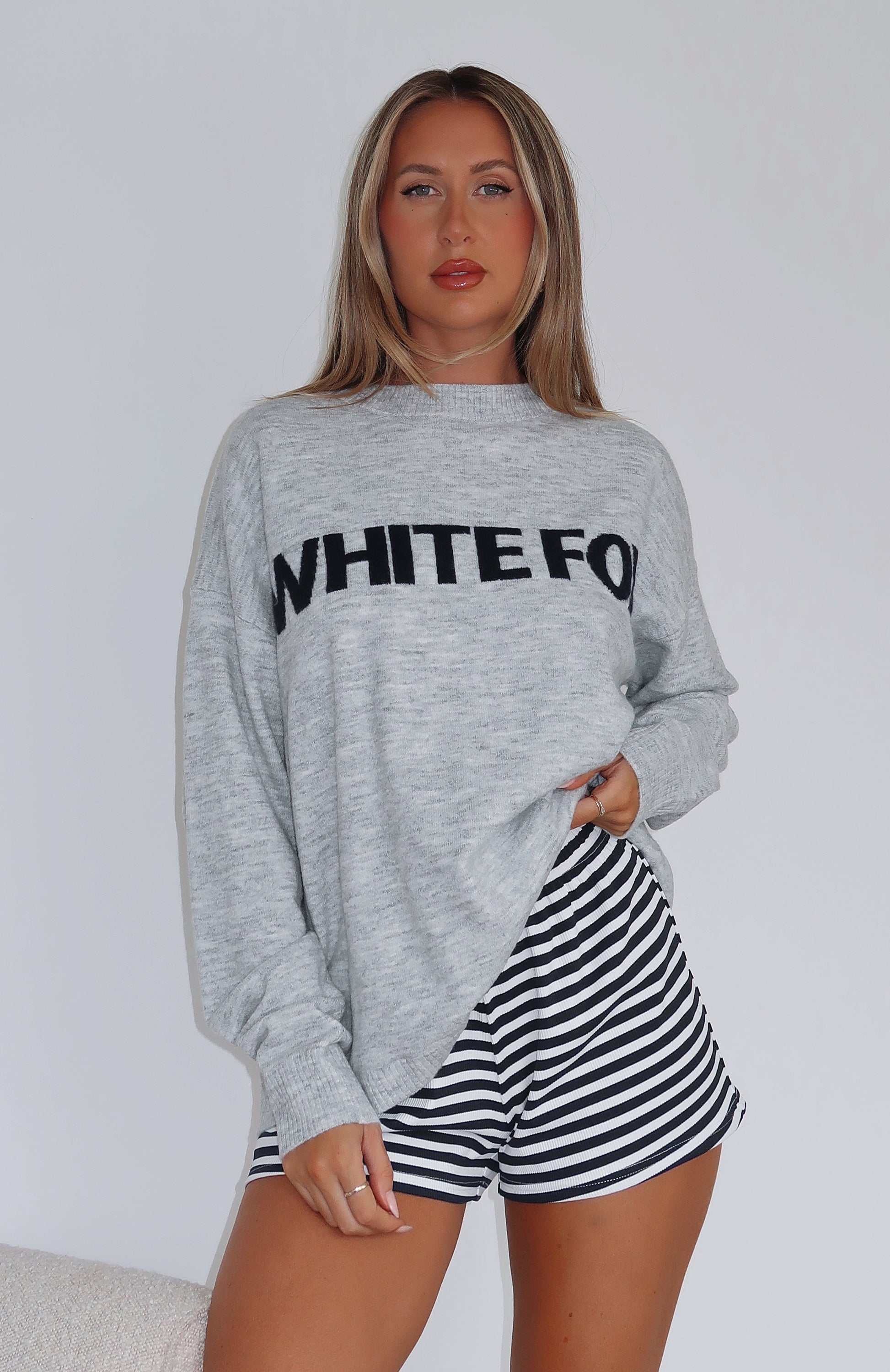 Say hello to your new season staple with the Set Me Free Knit Sweater Grey Marle. Featuring a high neckline, oversized fit, drop shoulder, front logo design and unlined, knit material. We love this paired with your favourite White Fox Jeans and Snug Boots for a cosy look!