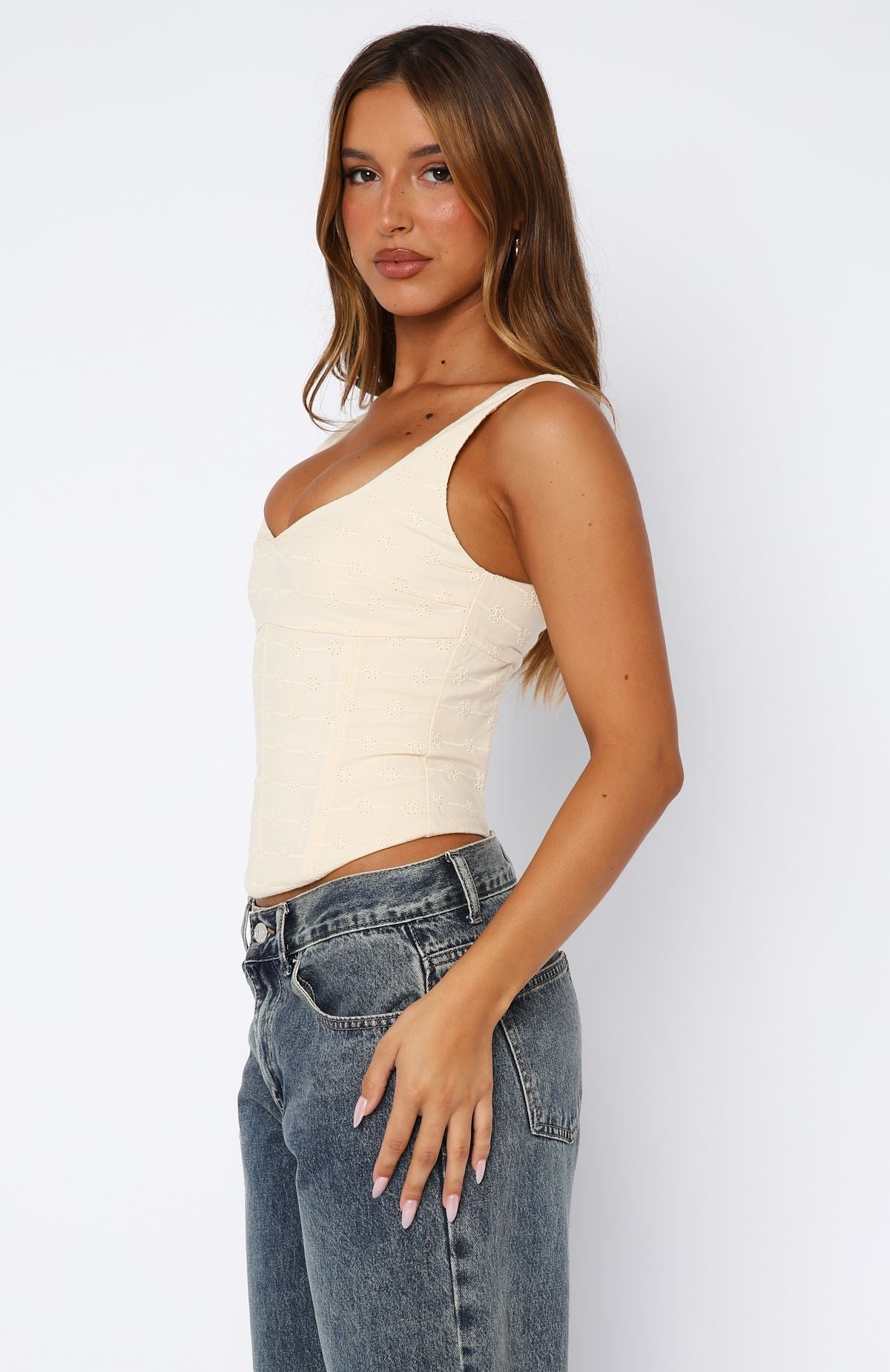 The top you didn't know you needed...Wear the Staring At You Bustier Cream on repeat! Features thick shoulder straps, backless, low plunge sweetheart neckline, boning in bodice, back zipper and clasp closure and cropped length.