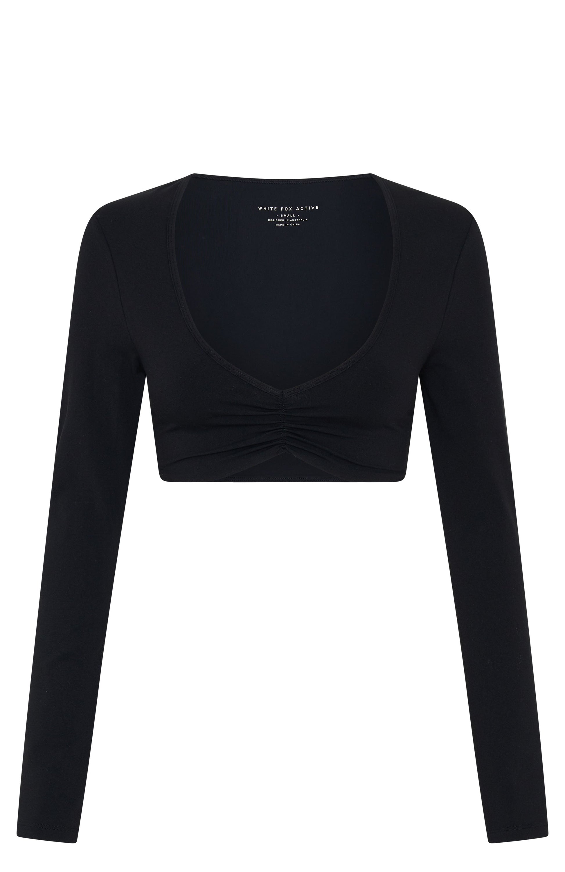 The Sync Long Sleeve Crop in Black is tailored for our pilates queens! Features a scoop neckline, scrunch detailing at bust, long sleeve, cropped and White Fox initial centre back. To complete the look pair with the matching Propel High Waisted Leggings in Black.