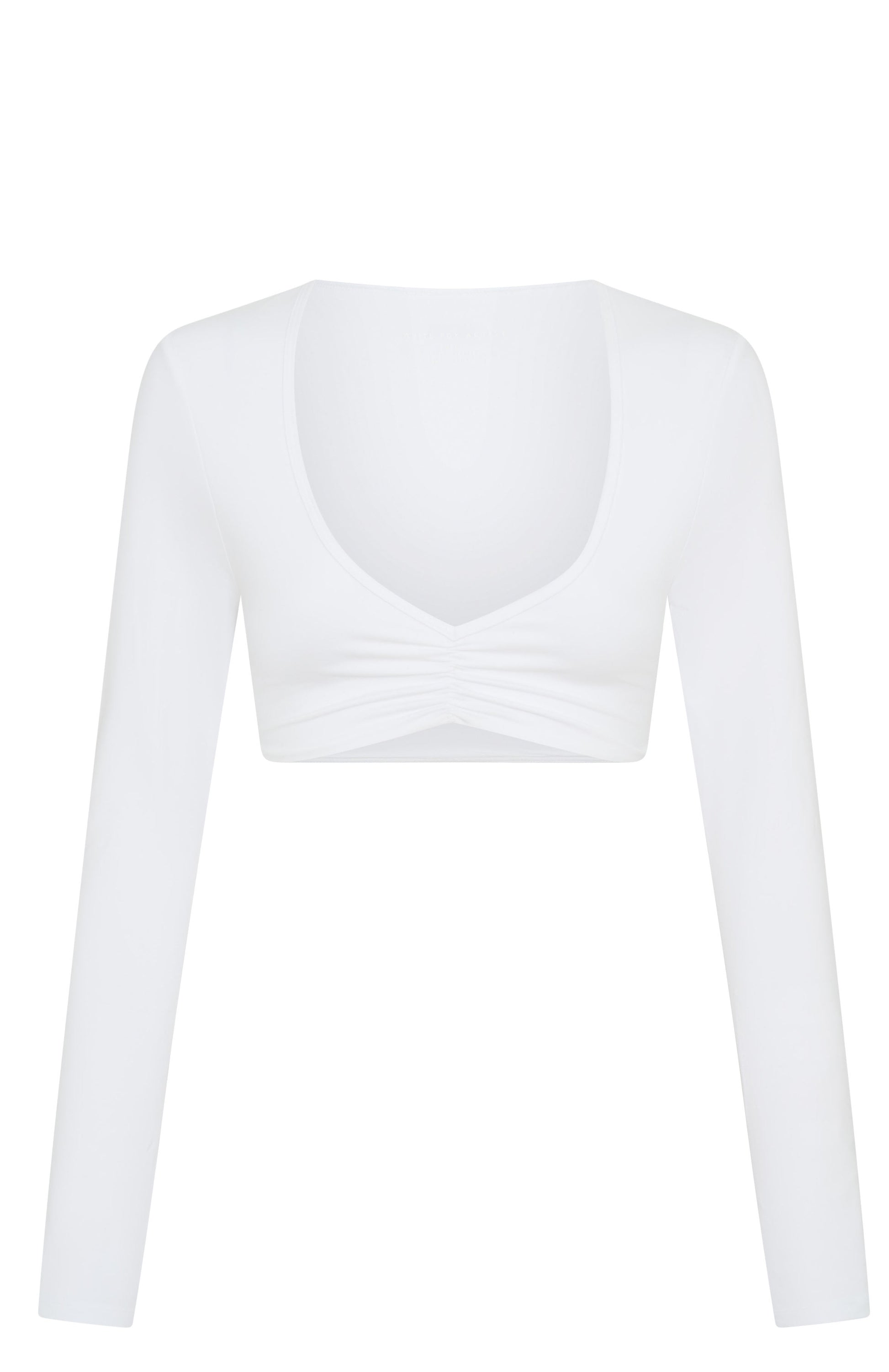 The Sync Long Sleeve Crop in White is tailored for our pilates queens! Features a scoop neckline, scrunch detailing at bust, long sleeve, cropped and White Fox initial centre back. To complete the look pair with the matching Propel High Waisted Leggings in Black.